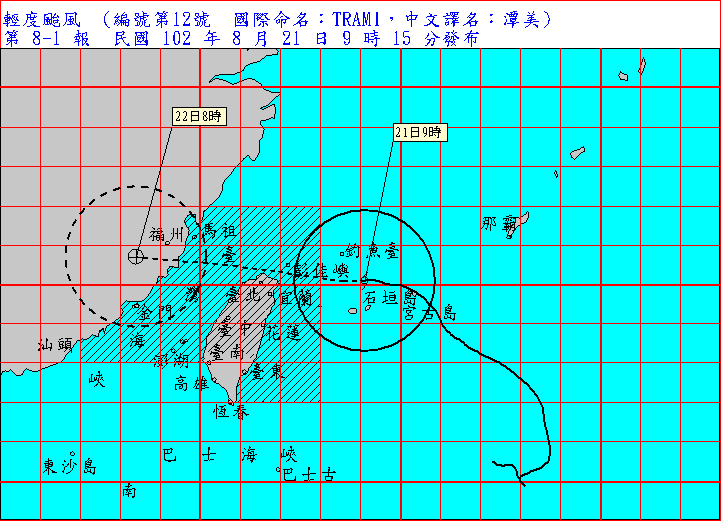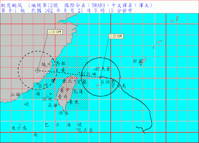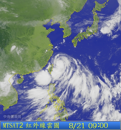 | 圖:2013-08-21-09:00 潭美(Trami)颱風衛星雲圖,引用自中央氣象局網站 |